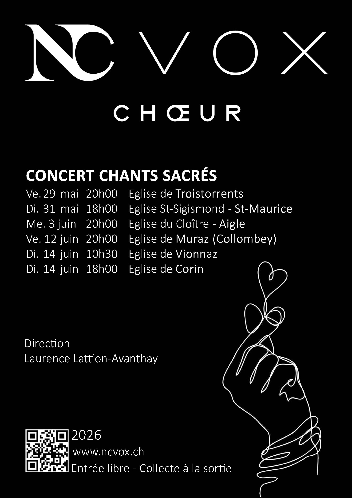 Date Vendredi 12 juin 2026 Catégorie Concert Lieu Eglise de Muraz (Collombey) Horaires 20h00 Tarifs Entrée libre - collecte à la sortie Groupement GSCBV Document Télécharger Voir le site https://www.ncvox.ch