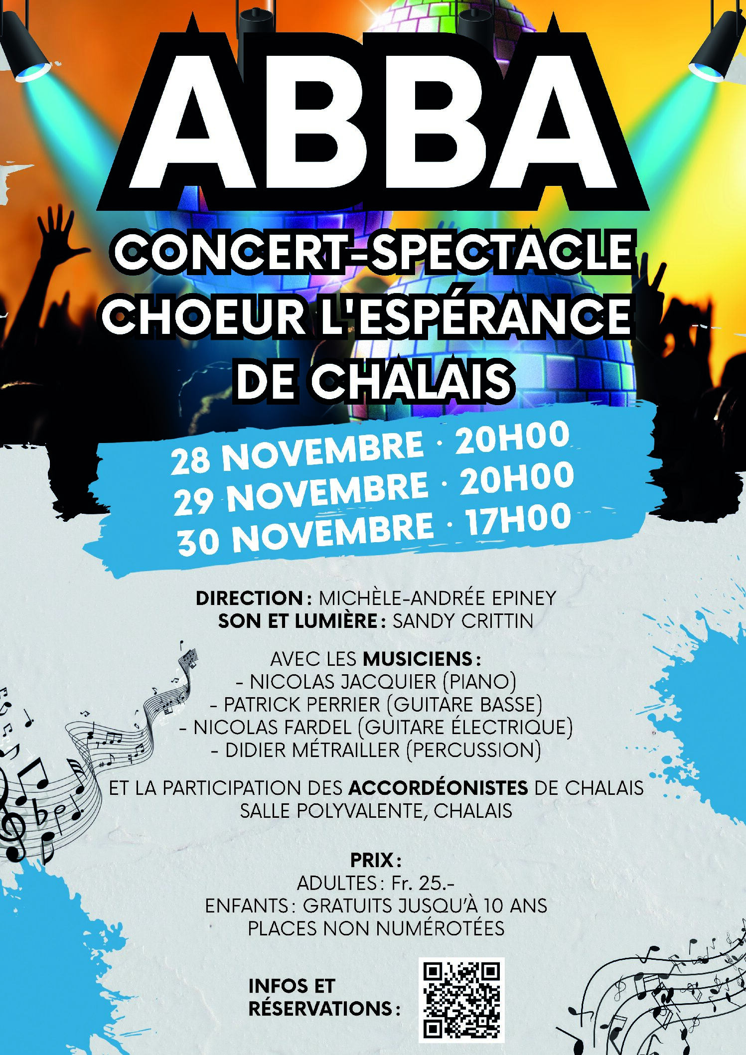 Cette année notre chœur-mixte a décidé de revisiter les tubes du célèbre groupe ABBA lors de 3 concerts-spectacles qui se dérouleront les 28, 29 et 30 novembre 2025 à la salle polyvalente de Chalais.
