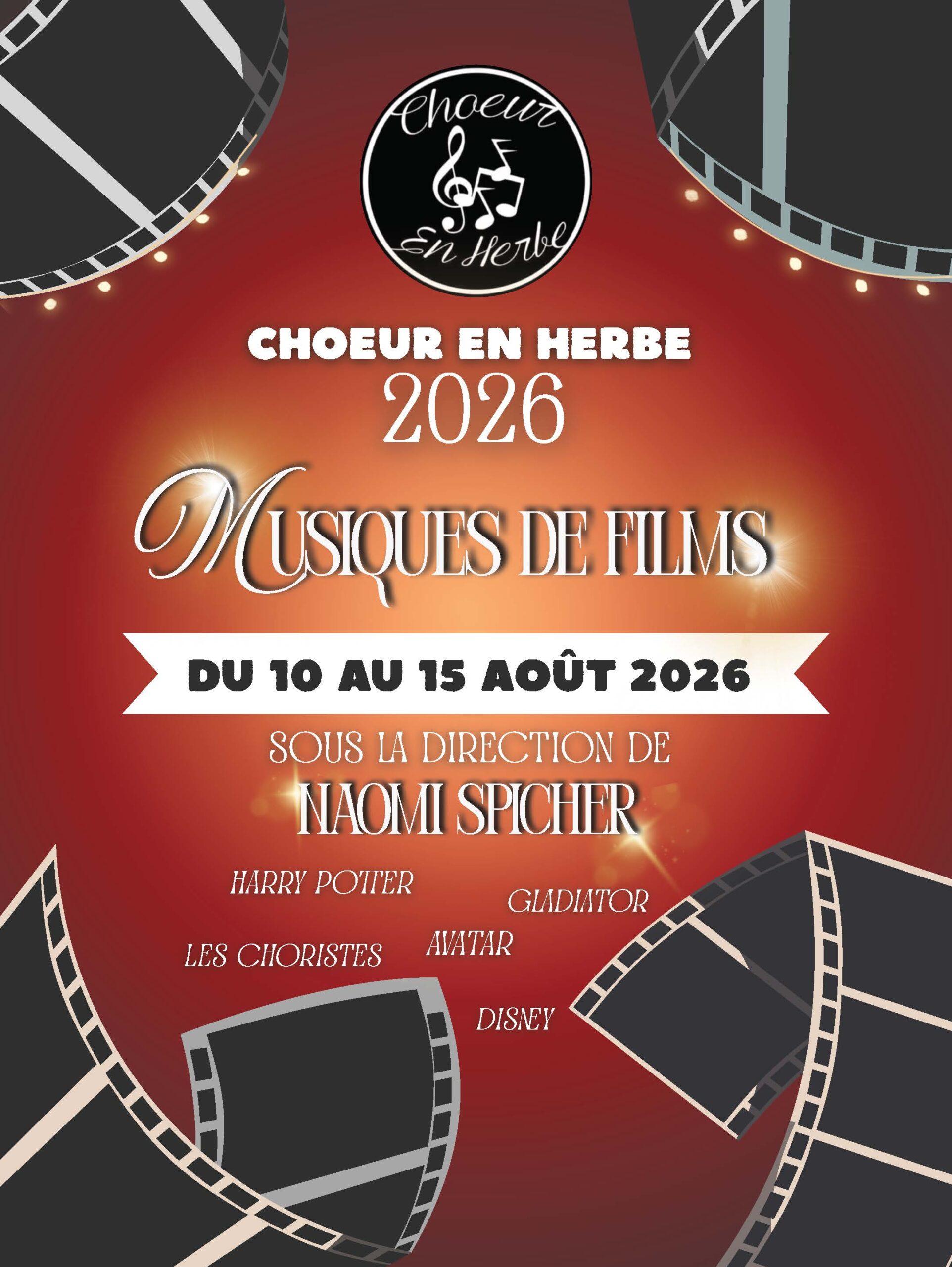 Sous la direction de la jeune et talentueuse cheffe fribourgeoise Naomi Spicher, accompagné d’un quatuor à cordes, Choeur en Herbe chantera les musiques de films lors de son prochain camp du 10 au 15 août 2026.